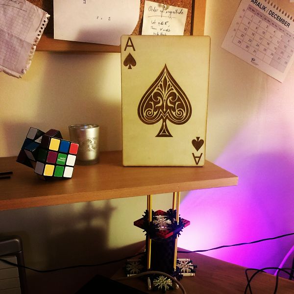 This is a gift from my good friend Görkem Tanca. He has an industrial workshop, where he creates beautiful objects out of thin wood by laser cutting and laser burning. I don't know why, but I always loved the spade shape. On top of this, it's on wood!