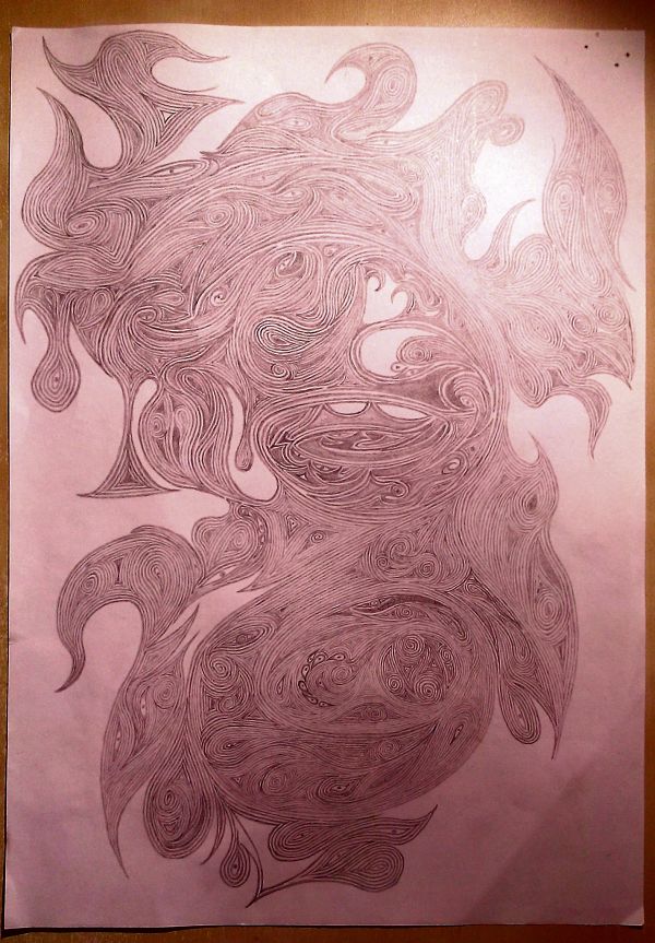 Well, this is... I don't really know what this is. I just drew some lines and went on with what I feel. I don't know if it's finished or not, and I certainly don't understand it. It's plain subconsciousness I suppose. One thing I can suggest is that you download this image and zoom in and out and rotate it. Each side and perspective has its own stories to tell.